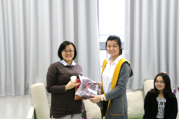 在本次交流活动临近尾声之际,孟宪承书院的黄虞婷老师向张老师送上了书院的冬季导师服,感谢其为书院学子的成长付出的辛劳。