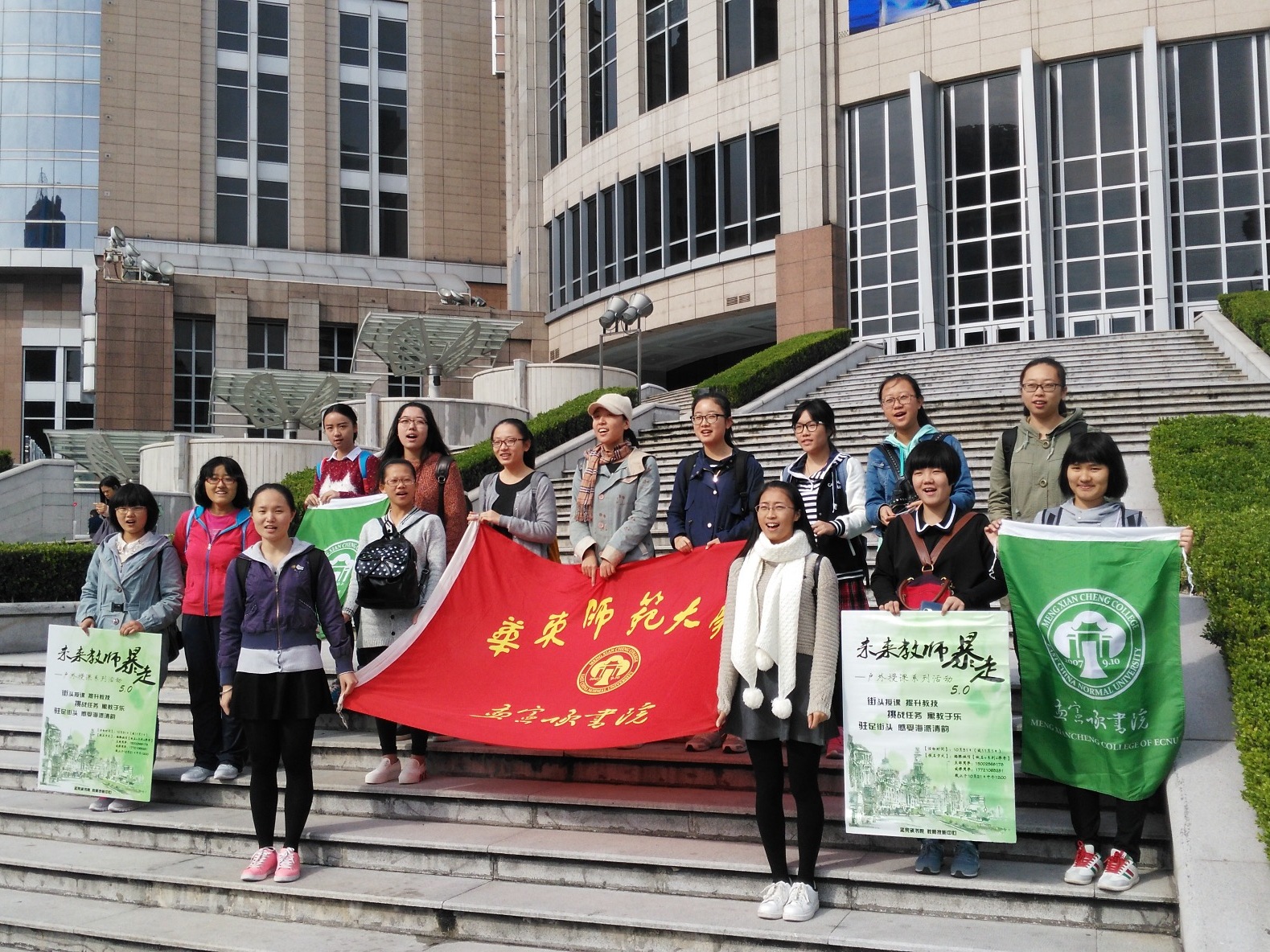 刚到达徐汇地铁站时,港汇广场还未从睡梦朦胧中醒来,于是选手们在港汇门口唱响的华师大校歌——点燃港汇购物中心的第一把火!我们用激情把校歌唱出了黄河大合唱的气势,引得路人纷纷拍照留念。