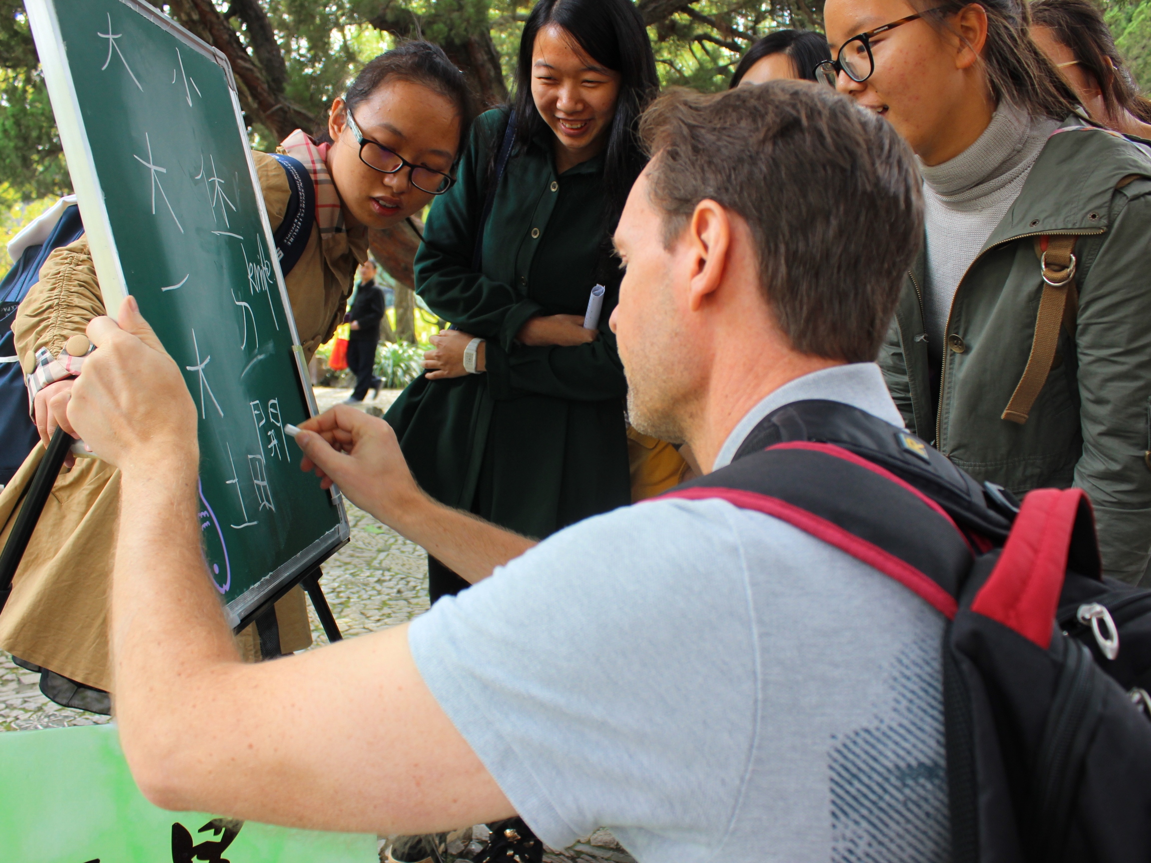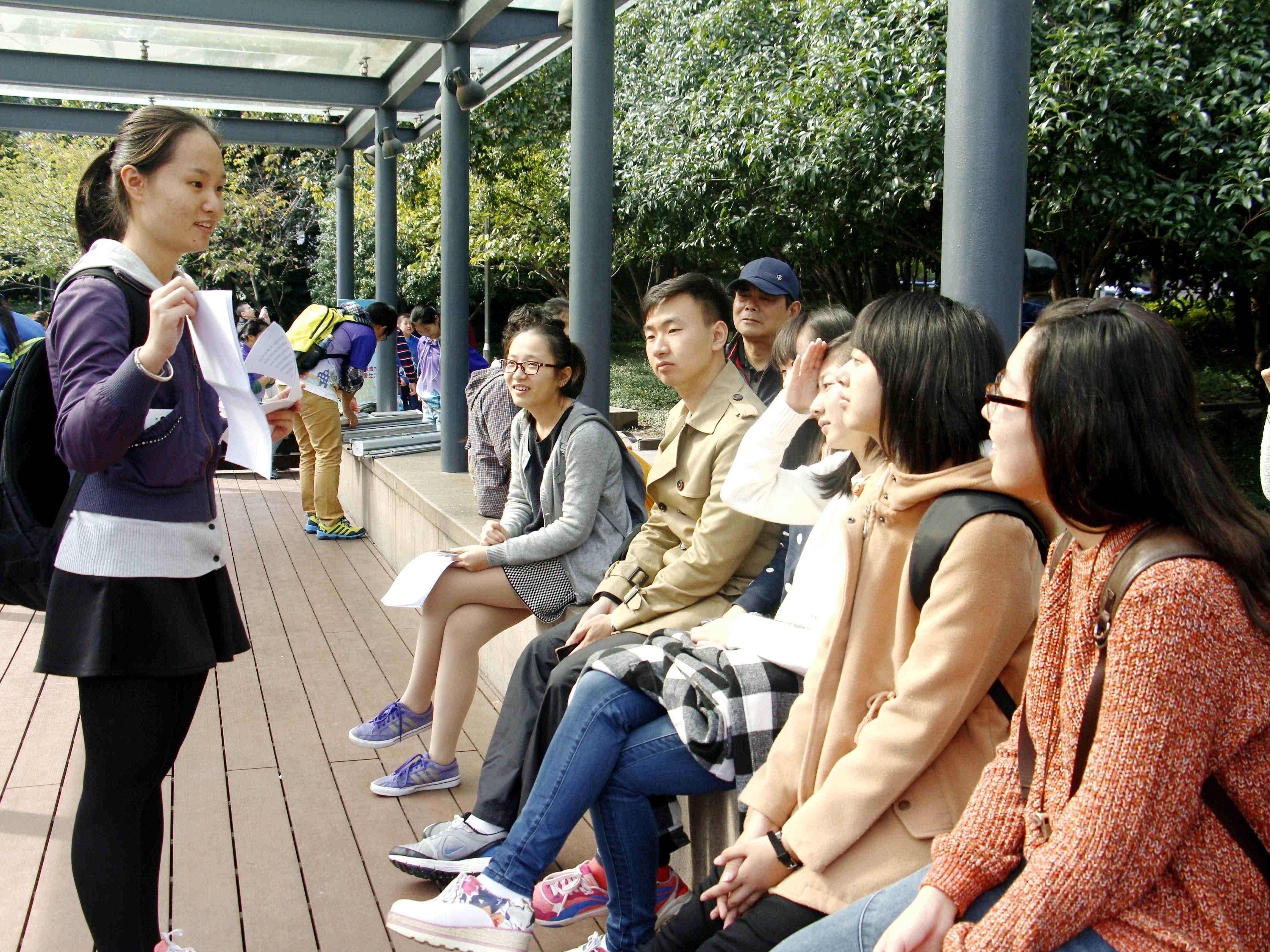 人民公园,怡人的风景,有趣的课程,热情洋溢的选手,还有被深深吸引的路人,构成了一幅和谐的图画。15级英语专业选手宋文钰给我们讲解了“国民要幸福”,教育、雾霾、物价,你可知道,在众多中国式现实面前,我们要如何保持自己的幸福?如何对待细节?如何找到提高国民幸福的正确途径?来自同一专业的孙步青同学也不甘示弱,向游客们讲解Chinglish式的英语错误,吸引了不少游客驻足,更有不少外国友人纷纷合影留念。