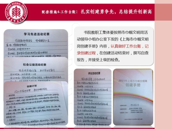 经华东师范大学推荐,孟宪承书院教职工集体申报创建2015年度上海市巾帼文明岗,以“九个一”为主要内容,积极踏实的推进巾帼文明岗创建行动:制定一个创建计划、开展一次业务主题活动、开展一次学习先进活动、开展一次读书会活动、开展一次社会公益活动、开展一次评议活动、开展一次检查交流活动、开辟一块宣传阵地、做好一本台帐。