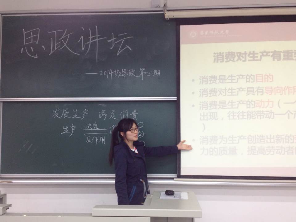 在团支书陈卓简短的开场白之后,本期主讲人之一,来自第三小组的王子璇同学从容自信的走上了讲台。她主讲的题目是“发展生产 满足消费”。讲课一开始,王子璇带着大家先回顾了一下上节课的知识,引出了本节课“发展生产 满足消费”的内容。在上课过程中,她始终保持着亲和温暖的笑容。从生产影响消费到消费反作用于生产,从iphone的发展历程到思考如何提高社会生产力,王子璇的上课内容十分翔实,完整的构建出了生产消费的关系这一主题。期间她不时和同学们的互动,引导和启发同学们的思考更是让课堂气氛变的十分活跃。可见子璇有着非常好的控场能力,这也是值得我们学习和借鉴的地方。
