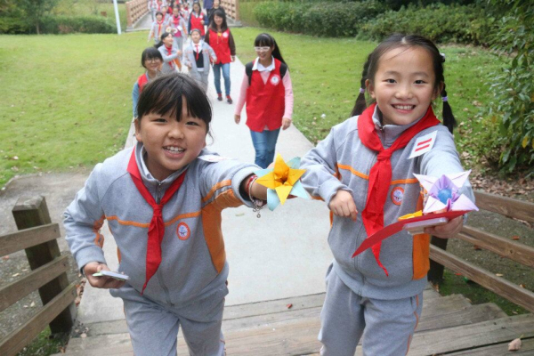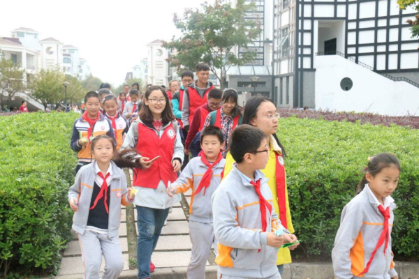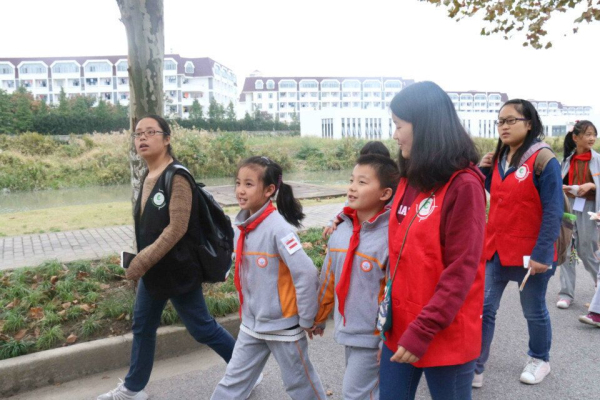 小朋友和志愿者欣赏校园美景