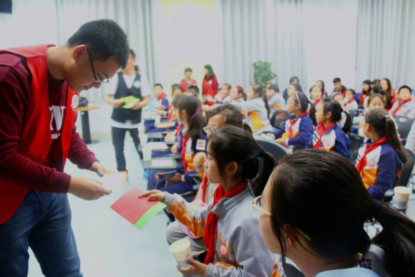 志愿者分发彩色卡纸给小朋友