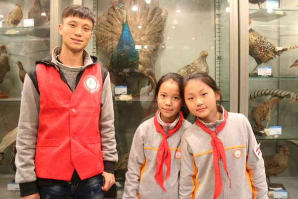 志愿者与小朋友们在标本前合影留念