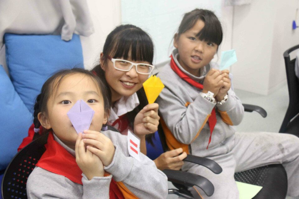 志愿者和小朋友们进行折纸游戏