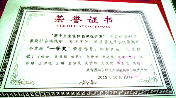2015年的暑假,生涯中心进行了首次“高中生生涯课程体验”的社会实践项目,让“生涯”理念生根到中学生中。该项目荣获“孟宪承书院暑期社会实践‘一等奖’”,奖状于近日下发,这不仅是对我们中心的一种肯定,更是一种激励,激励我们更加努力!