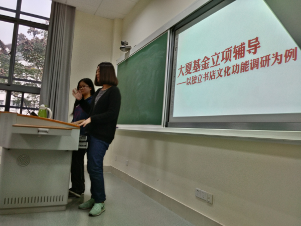 竺洪波老师特意叫来两个大三的已经快要结项的宫晓瑄学姐为同学们进行关于“独立书店文化功能调研”的项目具体介绍。宫晓瑄学姐首先为同学们进行大夏基金项目介绍。接下来,宫晓瑄学姐以自己的研究小组为例,耐心细致的为同学们进行了如何进行科研小组的组队 ,如何确立一个值得深入研究的问题,以及如何填写大夏基金项目立项申请书等同学们感兴趣的问题解答。最后宫晓瑄学姐还为同学们介绍了关于国内外的电子资源检索平台,进一步给同学们的项目研究提供了切实可行的方法。