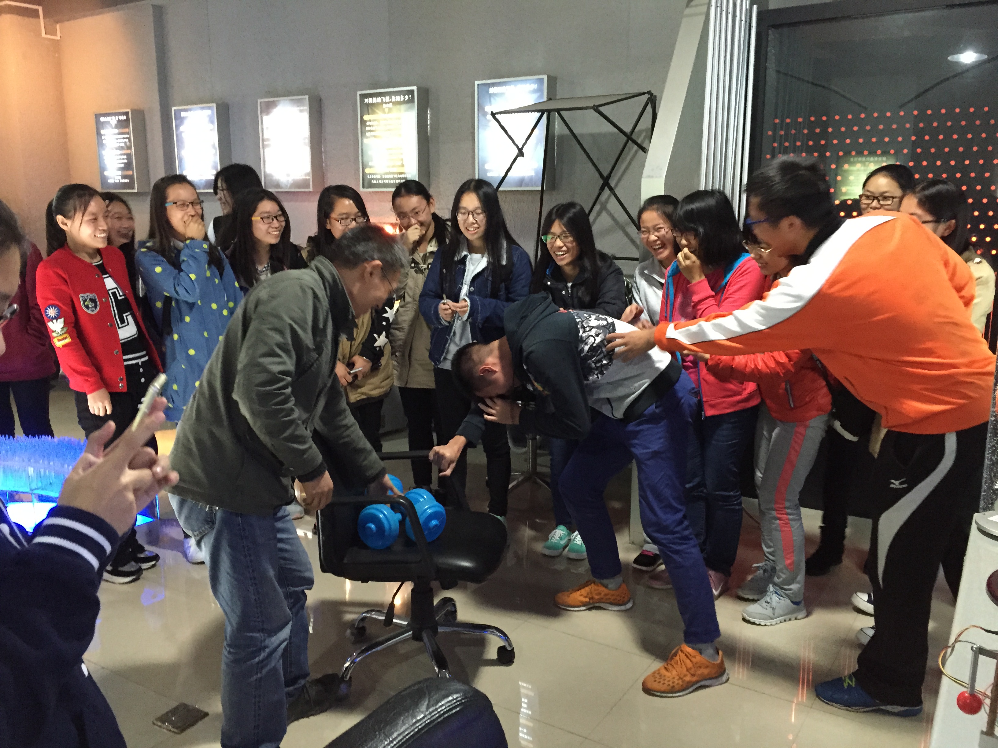 随后,黄银强同学代表大家坐上了转椅,学着景老师的样子转动、伸展。银强同学从椅子下来的时候,已经头晕得站不住脚了。
