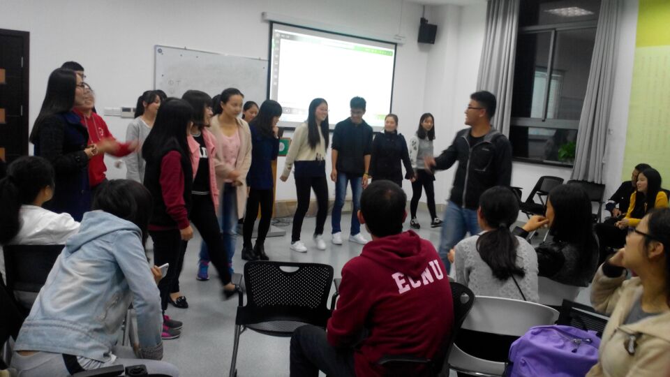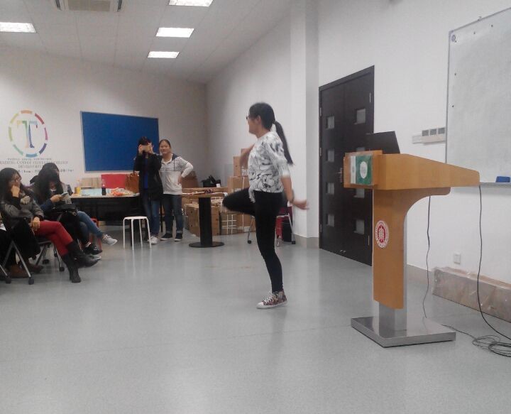 活动一开始,第三小组的同学在大家的欢笑声中进行了趣味自我介绍。首先由多才多艺的蔡宇慧同学为大家讲解了各种舞蹈,并带来一段精彩的舞蹈。各个小组的同学都踊跃地上台进行模仿,气氛顿时欢乐起来。