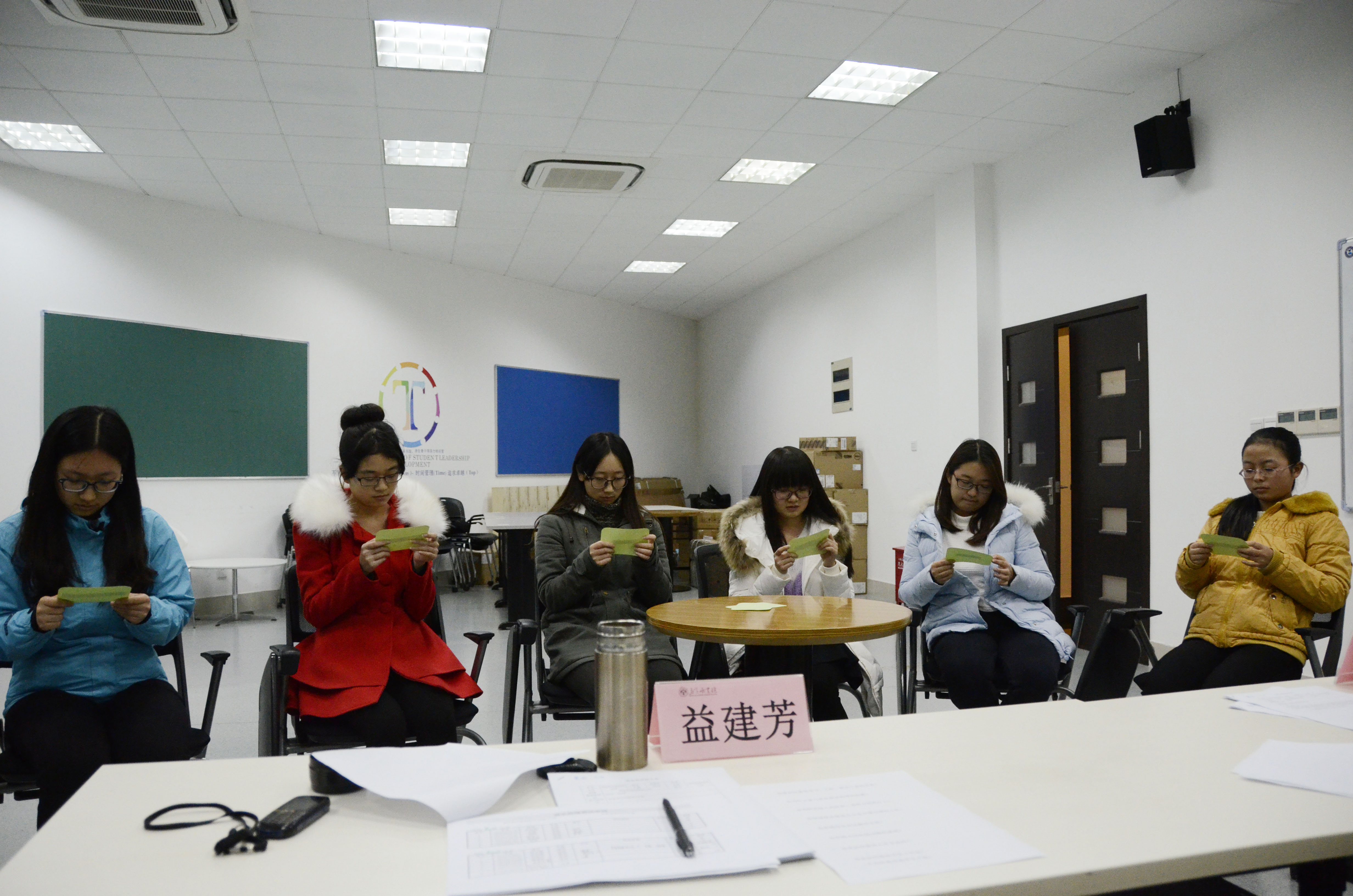 面试共十组,每组6人,从15:00持续到17:30。在面试中,面试者首先进行一分钟的自我介绍,进而随机抽取一个相关问题现场作答。