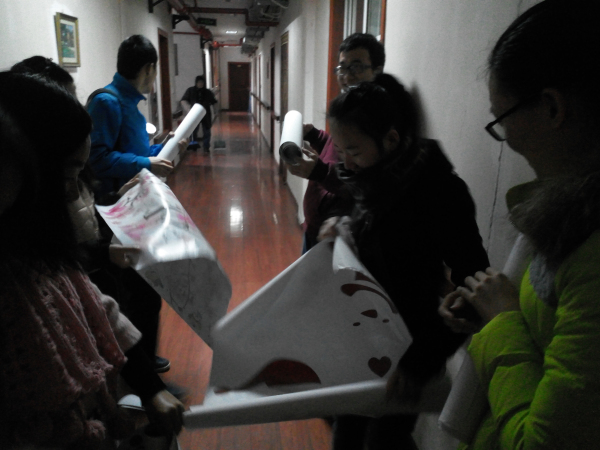 早晨8点,小组人马在楼下集合,出发。8点40抵达吴泾夕阳红养老院。一进门,略显仓促莽撞,进去观察贴壁纸的布局?找负责人?和前厅的爷爷奶奶介绍自己?似乎在一刹那乱了阵脚。这时,在组员的提醒下,组长稳住了那一霎的慌乱,先向坐在前厅的老人们问好、自我介绍并且交代活动主要内容,之后沿走廊右拐进院长办公室,找院长确认之前接洽好的装扮事宜。在这一过程中,老人们表现出了很高的期待和参与热情,院长在得知他们之前已经和其他负责人打好招呼的情况下也对此次计划非常肯定,这一切都给了整个活动组极大的鼓励。