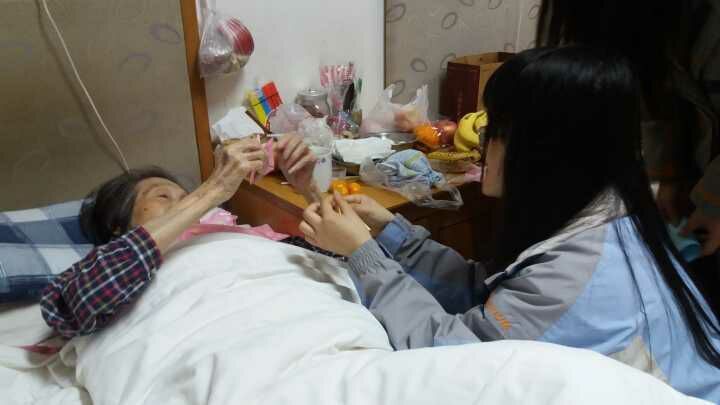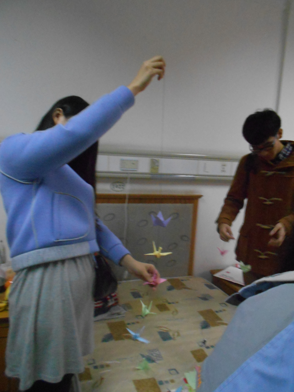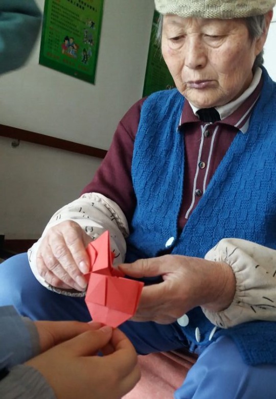 此次活动内容主要是陪伴聊天与做手工——折纸鹤。当日上午8:30,活动成员集合后,在对敬老院活动的讨论声中乘公交车出发。9:00,准时到达敬老院,开展活动。活动以走进老人房间,来到老人床边的形式开展,八位成员分为四四小组分别看望两个房间的老人。位于走廊口房间里的奶奶,虽行动不便,但十分健谈。志愿者坐在床畔,嘘寒问暖,再加奶奶热情的招待,很快便熟络起来。