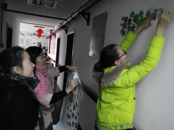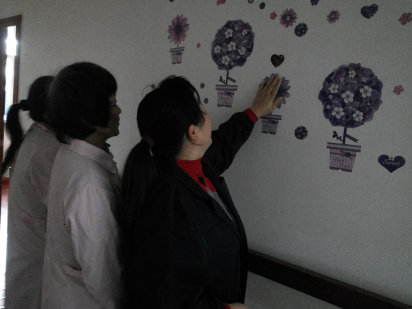 说干就干。首先,大家粗略地参观了一遍养老院,了解了养老院的大致布局,开始讨论贴壁纸的具体操作方案——什么地方贴什么,什么东西往哪儿贴,等等。讨论好贴壁纸后,分读报纸的任务,分配妥当之后,大家便行动了起来。