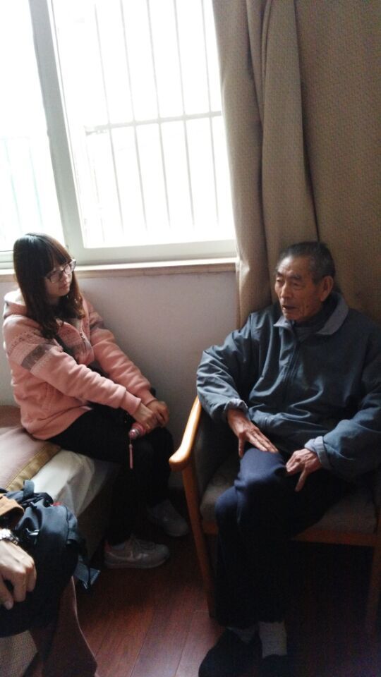 之后听到要拍照,奶奶还认真的梳理了自己的头发。靠走廊尽头房间里的两个爷爷,接近七十岁与九十岁的年纪,但身体都还很硬朗。在志愿者进行问好之后,两位爷爷热情的让出座位来。一位爷爷自豪的讲述了自己在部队的故事,志愿者们听的都入迷,同时也对当时情况有了了解。