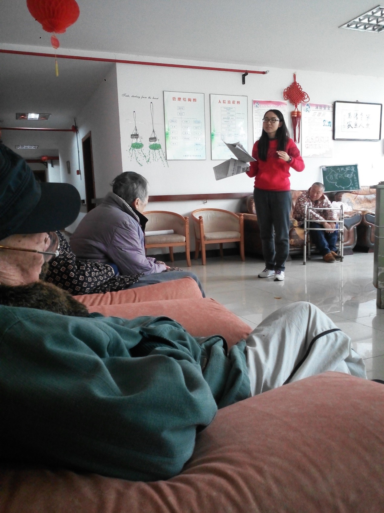 在整个活动过程中,爷爷奶奶叔叔阿姨们并非只当看客,他们中的很多人非常配合。有的给贴壁纸的同学们建议贴哪里更好,比如,有一位奶奶特地指着院长办公室门对着的那面白墙说“给头头的门口贴点,他一开门就看见,哇!”,上海方言味儿十足的普通话说了好多遍志愿者才听懂,虽然奶奶的观念有点陈旧,可她对志愿者们的热忱可见一斑;有的围绕着读报纸的同学积极地应和,注视、倾听、点头甚至有时会跟读。在整个活动接近尾声时,有些爷爷奶奶还自发地沿走廊看志愿者们的成果,表示非常喜欢。有的老人不住地对志愿者说“蛮好的,蛮好的”,还有很多老人说谢谢,说志愿者们在冬天把屋子变得温暖美丽。这些话说得志愿者们心里也是非常欢喜,在老人们看那些贴好的壁纸时,他们在一旁陪伴、聊天、拍照、合影,许多爷爷奶奶听到要照相特别开心,于是志愿者们当时决定回去把他们的照片洗一些出来送给他们。除了在那儿生活的老人,在那儿工作的阿姨、院长也夸他们装饰得美丽,同时来看望老人的一些医生、家属对于志愿者们的读报纸活动也给予了很好的评价。