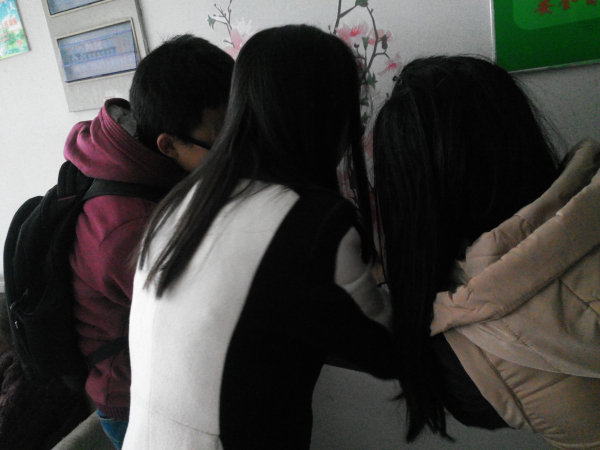 大家一个个贴得非常仔细,既考虑画面布局,也考虑粘贴效果是否平整等等,配合也非常默契。这边贴得热闹,那边读得也是耐心认真。