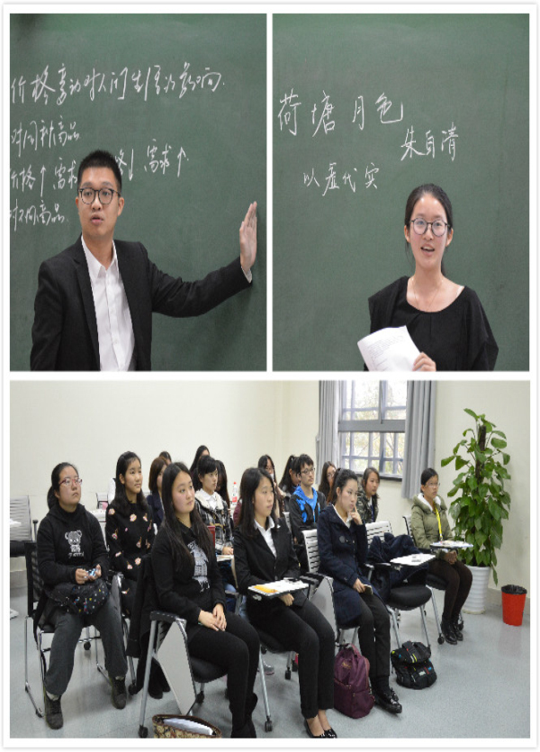 文科赛场上,思想政治教育专业的赵钰宁同学关注时下热点,运用双十一购物狂欢节促进消费的案例,清晰明了地揭开经济生活的奥秘。汉语言文学专业龚佳丽同学带来的荷塘月色的授课,以富有条理的板书及生动的课堂互动得到了评委的一致好评。 “艺术源于生活,高于生活”的哲理则是美术专业的钱宇菲同学,在视频和图文结合的愉悦氛围中,带大家走进一场艺术的饕餮盛宴。