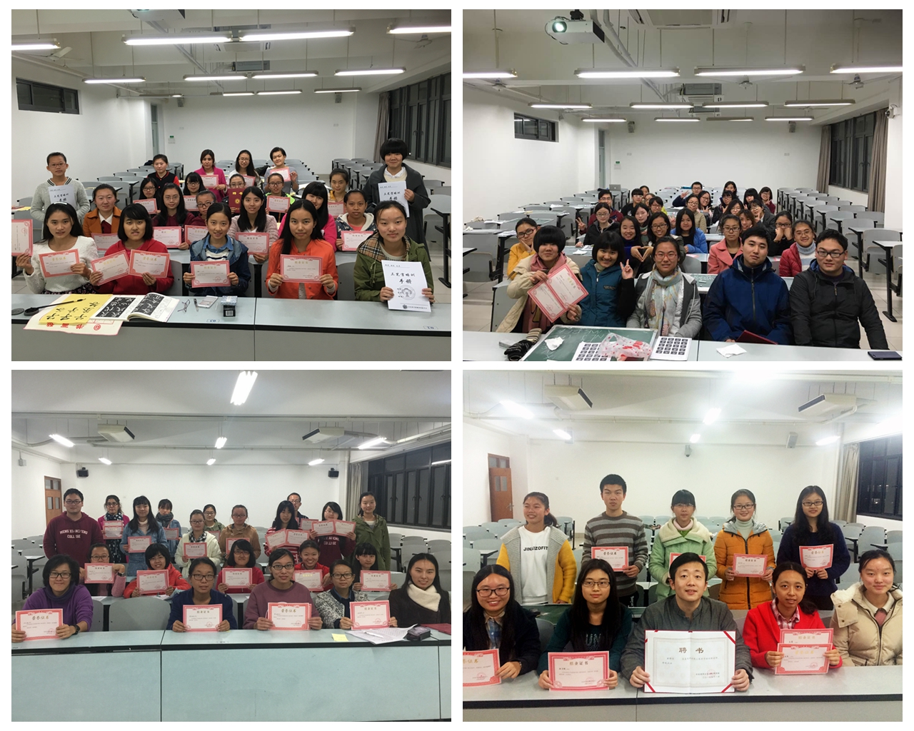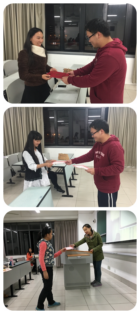 2015年11月底,“三笔字”培训结业典礼在三教233室和四教229室成功举办。从丹桂飘香到寒雨连绵,历经两个月,三笔字培训班迎来了结业典礼。大屏幕上的幻灯片,叙述着两个月内我们一笔一划书写的美好。