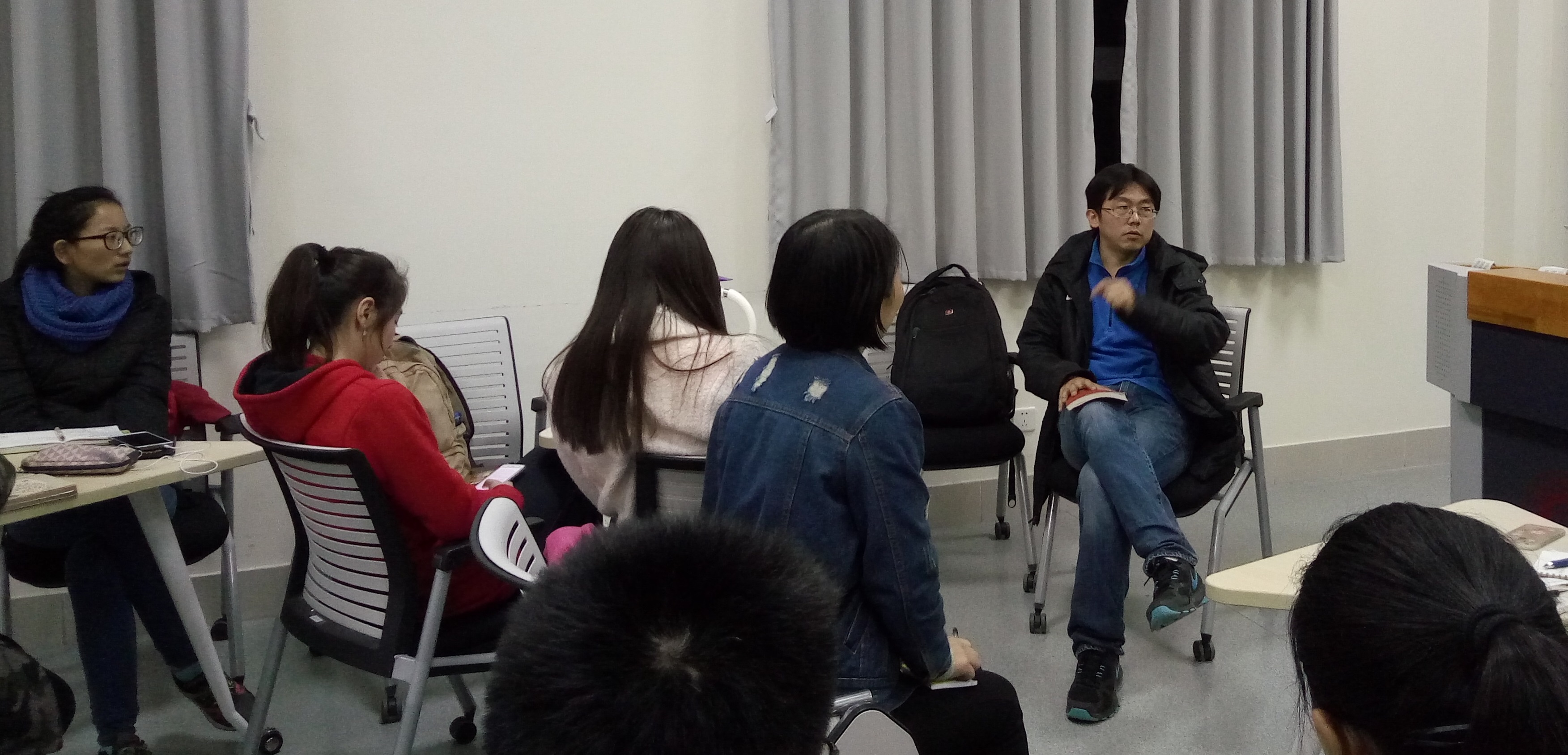经过了半个月的漫长等待,12月4日晚,我们终于在共享空间迎来了孟宪承书院生物科学系张伟老师的导师见面会。今天的天气异常寒冷,可当我来到共享空间时,张伟老师已经和一位12级的学姐在聊天了。想必张伟老师一定早早地来到了教室!学姐参军两年,用张伟老师的话说就是“女中豪杰”。从学姐挺拔的坐姿看得出来,这两年在军中一定得到了不少锻炼。