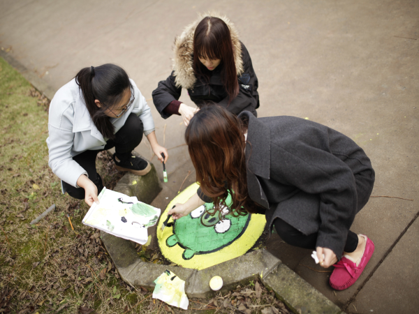 2014级美术教育专业挥洒色彩,巧思精画,提醒我们小心脚下的同时,让黯淡的井盖重新焕发光芒,又给华师大的道路增添了趣味丛生的个性。可爱的卡通人物跃出二次元,在我们身边露出了笑脸;创意的艺术经由美术专业的才子才女之手,由高雅的殿堂融入了我们的生活微处。