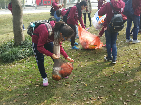 与此同时,2015级数学专业一班和二班在滨江公园清走游人留下的垃圾。风景因他们亲手呵护变得更加美丽,他们的笑容也更加灿烂。