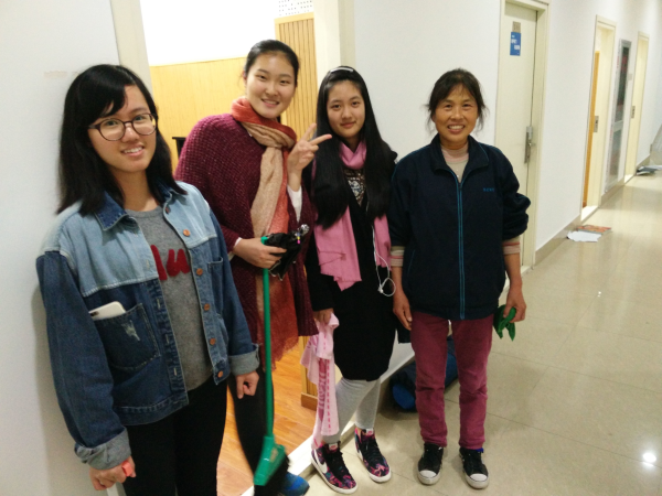 书院2015级音乐教育专业的同学们亮出扫把、簸箕、抹布,帮助清洁阿姨打扫了音乐系楼。他们与阿姨一起,扫走疲惫的尘埃,洒下快乐的笑容。