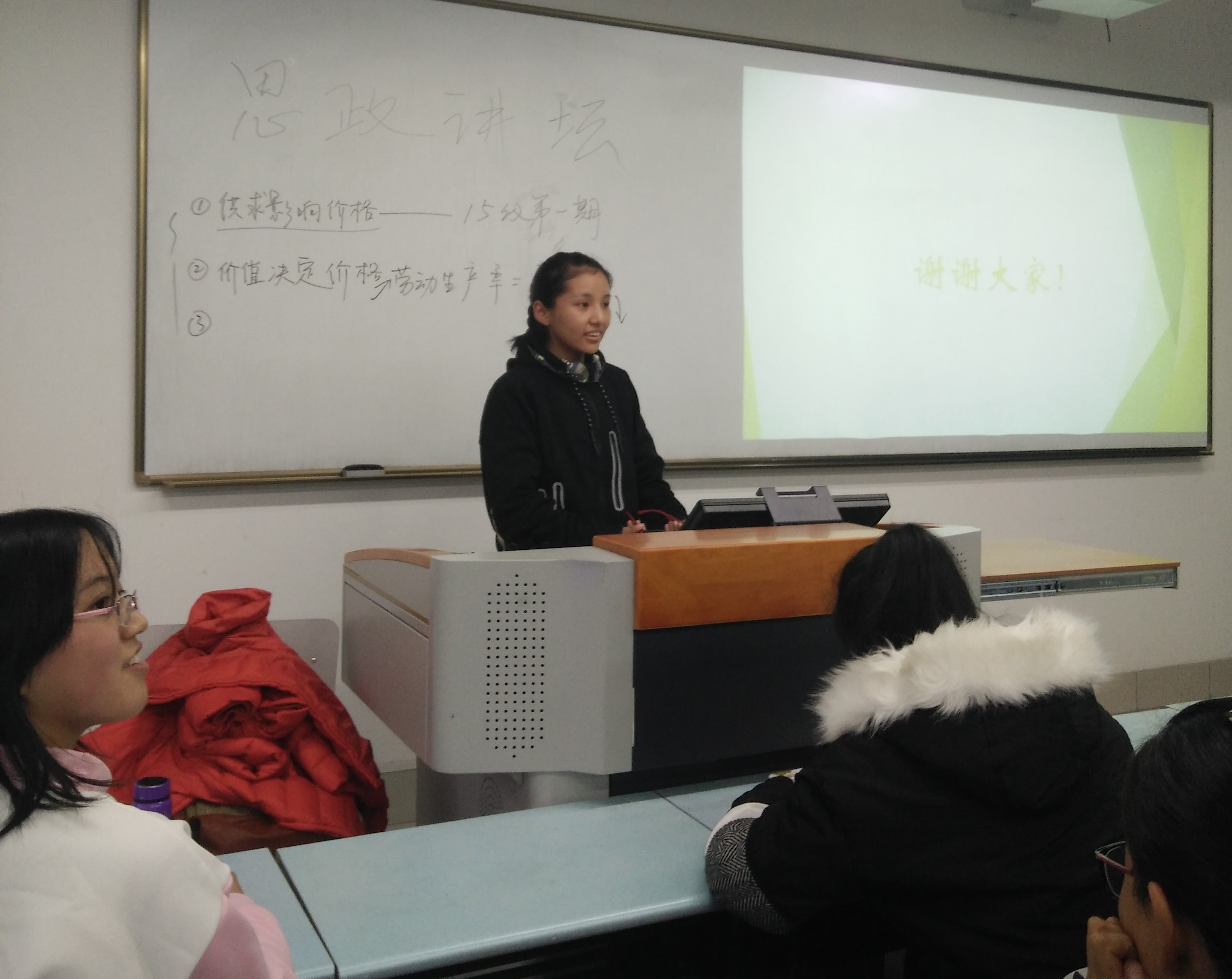 首先踏上讲台授课的是冯桐华同学,尽管桐华同学是第一次授课,但是她却表现得十分淡定从容。通过吃西瓜的实例自然引入《经济生活·多变的价格》一课,使整个课堂气氛轻松而活泼。桐华同学耐心细致的为同学们讲解价格与价值、社会必要生产时间与社会劳动生产率之间的关系,再加上与同学间良好的互动,原本让人感觉错综复杂的数学关系变得清晰明了起来。桐华同学授课结束之后,刘萌萌同学、木尼热同学、刘晓梅同学都细致指出了桐华同学授课过程中的如PPT风格、板书等相关问题,这些都是桐华同学提高自己教学水平的宝贵建议。