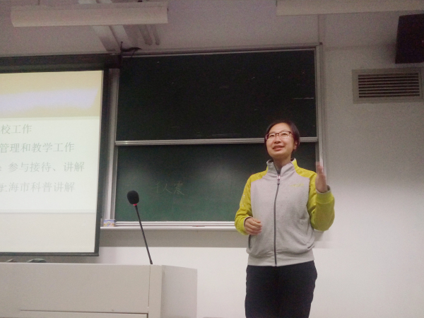 新加入的14、15级志愿者们满怀热情,在上阵之前请到了王老师分享做好这份工作的相关经验。她从衣着动作礼仪、讲话技巧、实验展示技巧等方面娓娓道来,每一份工作的背后,都蕴含着丰富的文化,她给我们挖出来的细节,不仅是我们做讲解员所必备的要求,也是对我们的面试大有裨益,更是对我们生活态度的升华。之后,景老师又做出相关补充,给我们讲解实验室讲解员的一些要求,无规矩不成方圆,我们的物理实验基地,要井然有序又不失冷漠,要优雅大方又不失理性科学。