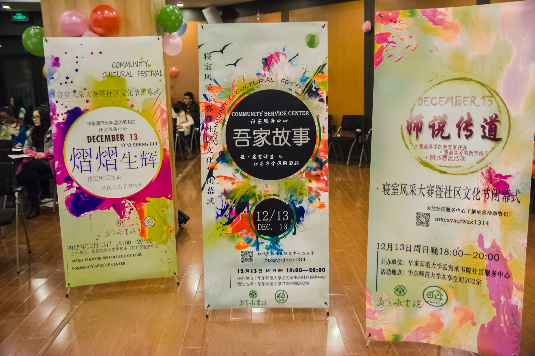 2015年12月13日晚在共享空间202室,社区服务中心组织开展了第二届社区文化节闭幕式暨楼层风采展示大赛。至此,为期一个月的孟宪承书院“Where there are you, there is home”社区文化节在此画上一个圆满的句号。