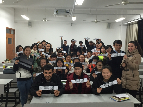 晚自习尾声,团支书把折好的宣传单发到每个同学的手里,同学们都十分喜欢这个小单子,在自习教室留影纪念后,便收拾好东西,朝目的地进发。