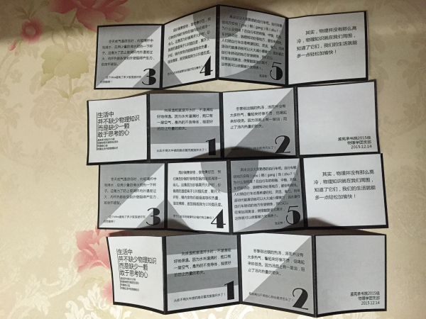 原来是15级物理学专业团支部组织的一场科普物理知识的微公益活动。本次团日活动意在根据生活中最常见的奇妙现象,向社区的同学们传播这些现象里蕴含的物理知识,告诉同学们,物理知识就在我们身边,是可以触摸、可以发觉的。也打破物理知识高冷、难学、不敢接触的刻板印象。在活动之前,同学们搜集和编辑了一些关于跟物理相关的小常识,李佩谦同学也别出心裁地做了一张精巧的宣传页,以期让同学们了解更多和生活很贴切的物理知识,提高大家对物理知识的兴趣和关注。