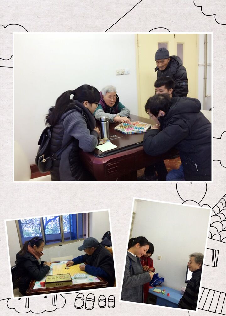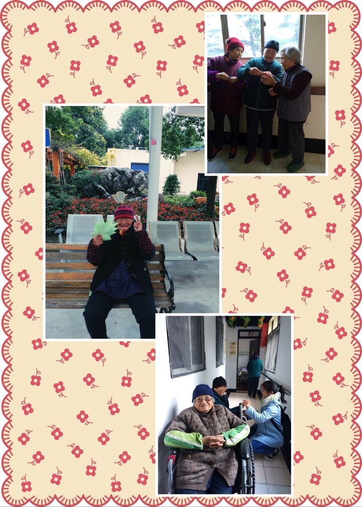 最后一次敬老院活动,全体志愿者再次齐聚吴泾镇敬老院。已经到了12月份,于是志愿者们分别组队进入老人的房间陪伴老人,活动形式多种多样。有的小伙伴在陪老人唠嗑、做简单的活动,有的小伙伴在和老人一起讨教折纸工艺,有的小伙伴在为老人表演民族歌曲,有的小伙伴在陪老人下五子棋和跳棋。