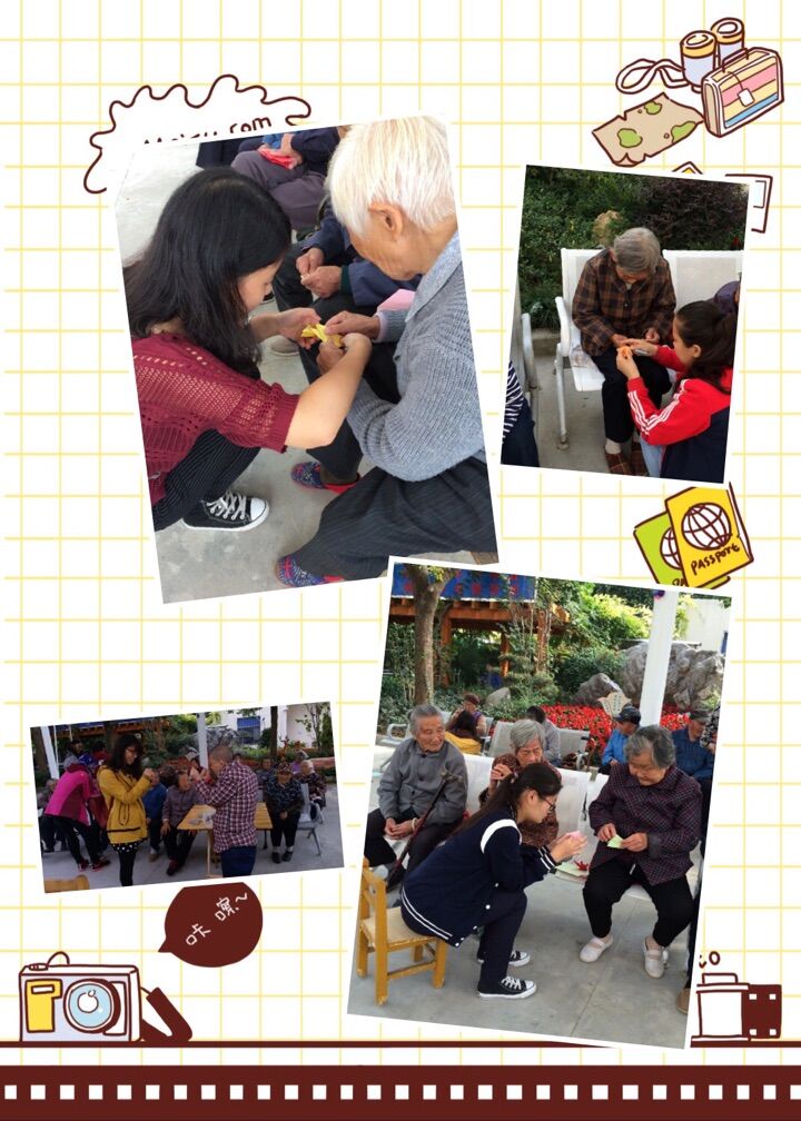 第三次去敬老院活动的是B组,这组的小伙伴准备的“秘密武器”是折纸活动。在活动开始前,志愿者们特意去学习了千纸鹤、桃心、鱼、船等简单易学的折纸工艺,然后打算去教授爷爷奶奶们,但是当爷爷折了一个又一个金元宝、帽子等可爱的作品时,当奶奶折了一个又一个各种形状的船只时,小伙伴们都惊呆了,纷纷像这些“宝刀未老”的爷爷奶奶们讨教。