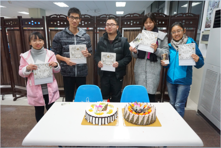 晚上六点多,用餐过后,大家一起为生日在12月和1月的同学过生日,班委们准备好了蛋糕,并为各位寿星准备好了精美的礼物,在各位同学的生日快乐的歌声中蛋糕上的蜡烛被吹灭;大家的生日快乐的祝福声温暖着每一位过生日的同学的内心。活动最后,所有参加此次活动的同学一起在屏风前合影作为留念。