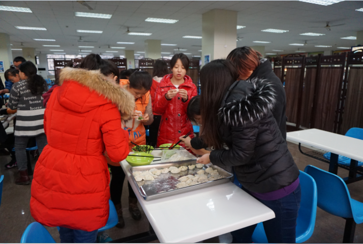 大约到下午四点半,全班同学和各位学长基本已经到齐,姚辅导员也参与其中。全班同学被分为四组,大家在四个桌子上包着饺子,同学们有的会包,有的不会包,不会的就向会包的学习习得一项新能力,姚老师加入其中的一组,包出的饺子更是受到各位同学的赞美,一时间整个食堂里充斥着大家的笑声,看得出来大家都很开心。经过一个半个多小时的包饺子工作,大家都包出了不一样的饺子,每一个饺子都有带着个性带着自己的特点,之后饺子由班委送去烹煮。