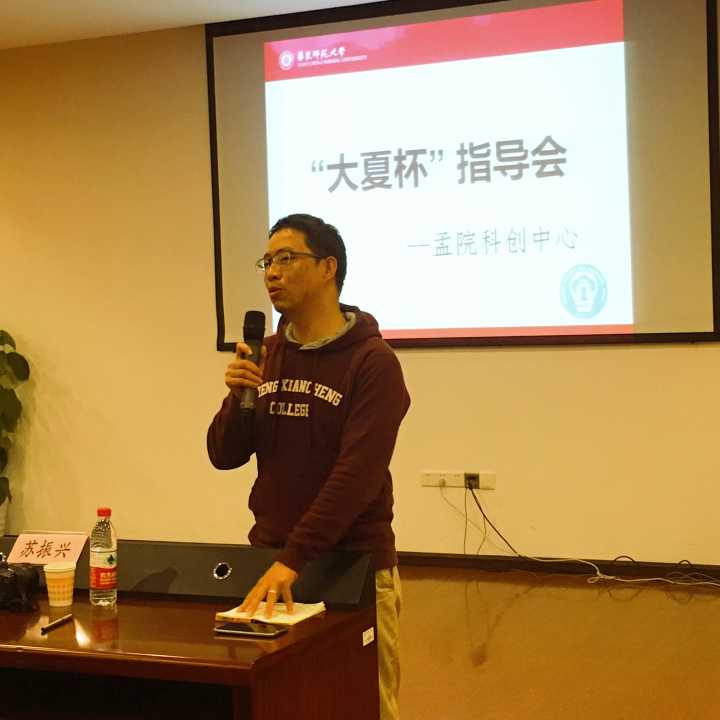 2015年12月15日下午在共享空间202室,科创中心组织开展了“大夏杯”指导会活动,为今年的“大夏杯”活动拉开了帷幕。校团委科创指导老师成一川老师,孟宪承书院副院长苏振兴老师,以及“大夏杯”一等奖获得者侯静惟学姐为参加此次指导会的同学们讲解了“大夏杯”的相关知识。