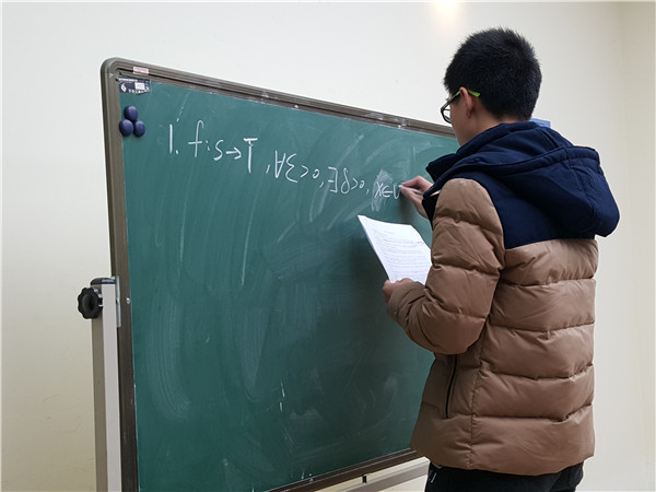 四位学习小组组长轮番登场,带领大家梳理数学分析各个章节的知识脉络。张文君组长负责实数与集合部分,这里的定义和性质多且零散,张文君组长耐心地一一介绍,小小的黑板被写满了一次又一次,其中还结合各种小提问,什么是实数的阿基米德性?良序定理又是什么?大家纷纷转动脑筋,积极思考,学习气氛立即浓厚起来。