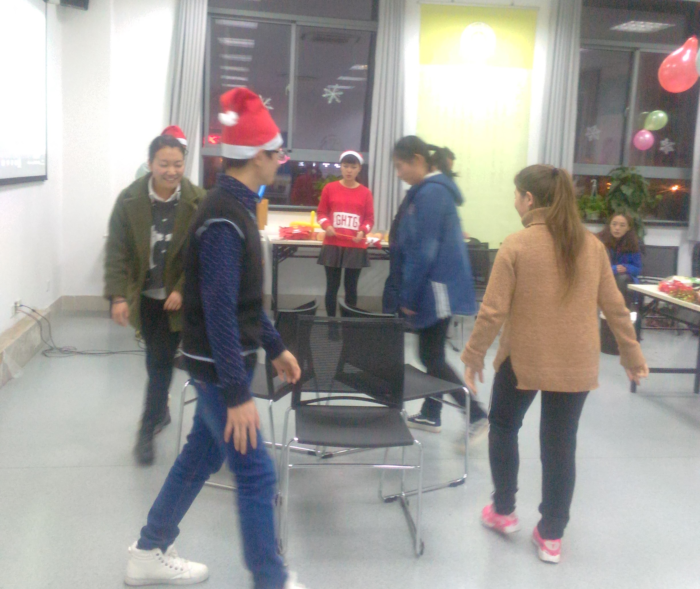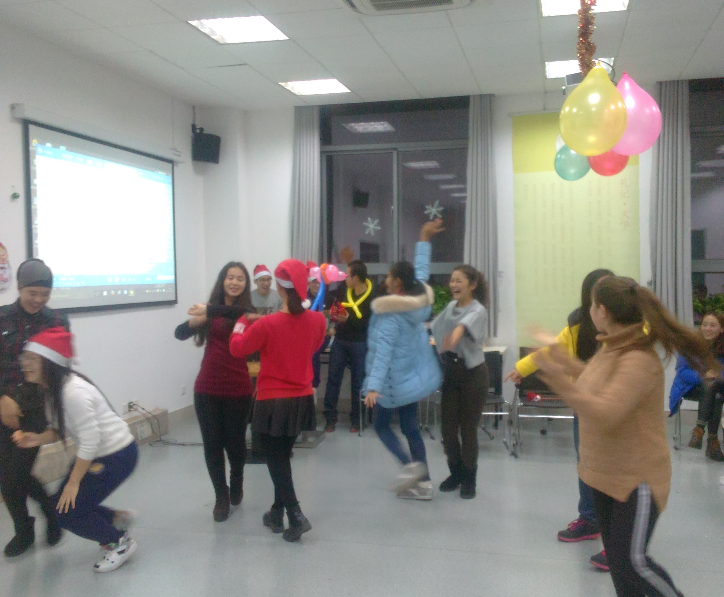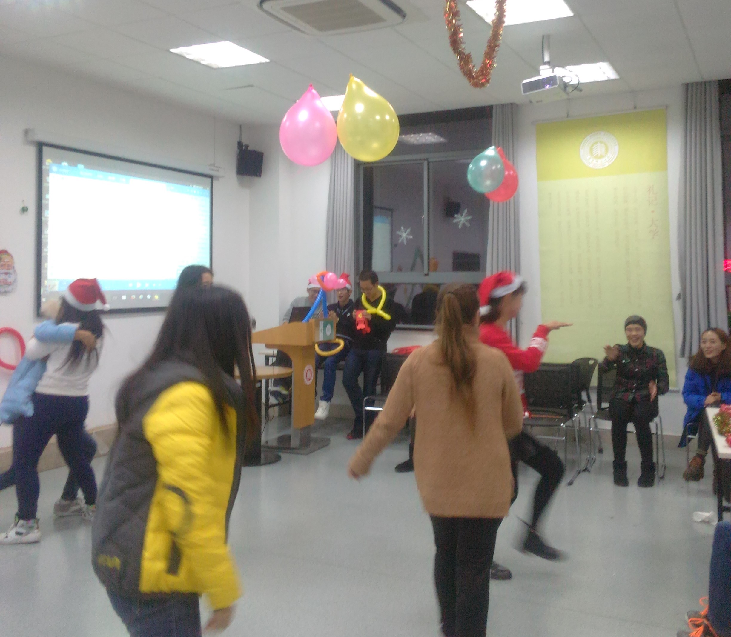 用彩带、气球装扮圣诞树,教室里面温馨。大家戴着小红帽忙碌着,给同学们准备礼物,食品和游戏道具。也有充满期待的同学们提前到达,在活动正式开始之前气氛就已经十分热烈。