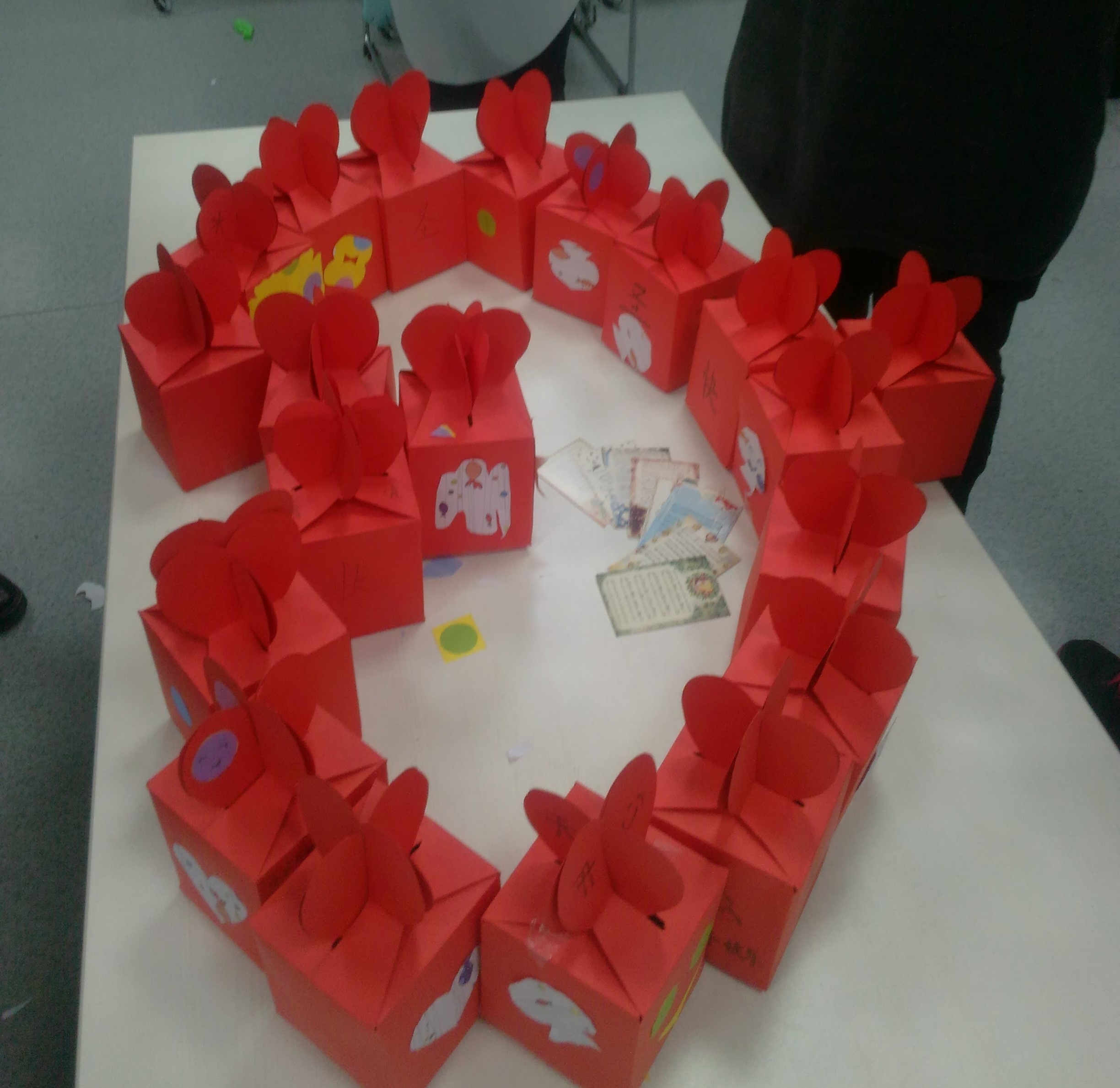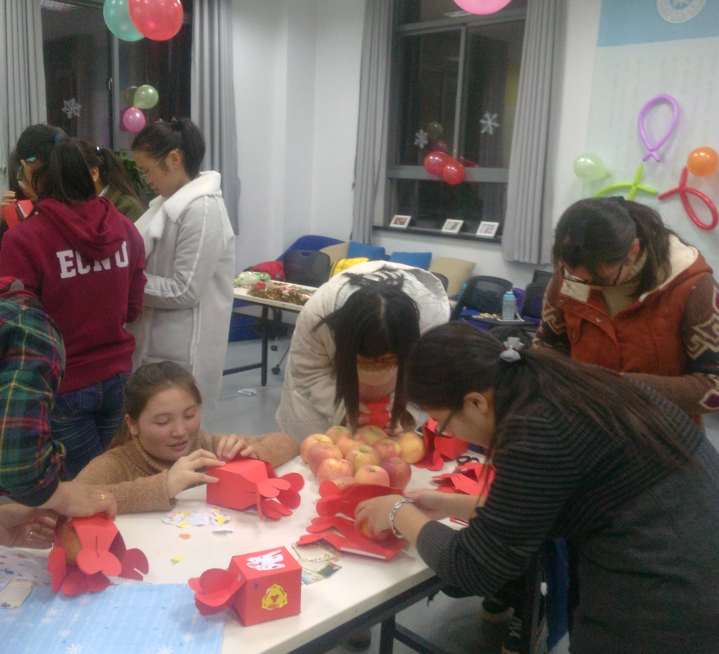 在大家的期待下,到了互赠苹果环节。吃平安果是平安夜的习俗,互赠平安果能表达互相之间的美好祝福。同学们用卡纸装饰做一个个独特而精美盒子,装上苹果,并在卡片上写下祝福。每个同学都收到来自其他同学精心包装,满怀情谊的平安果,心里泛起融融的暖意。