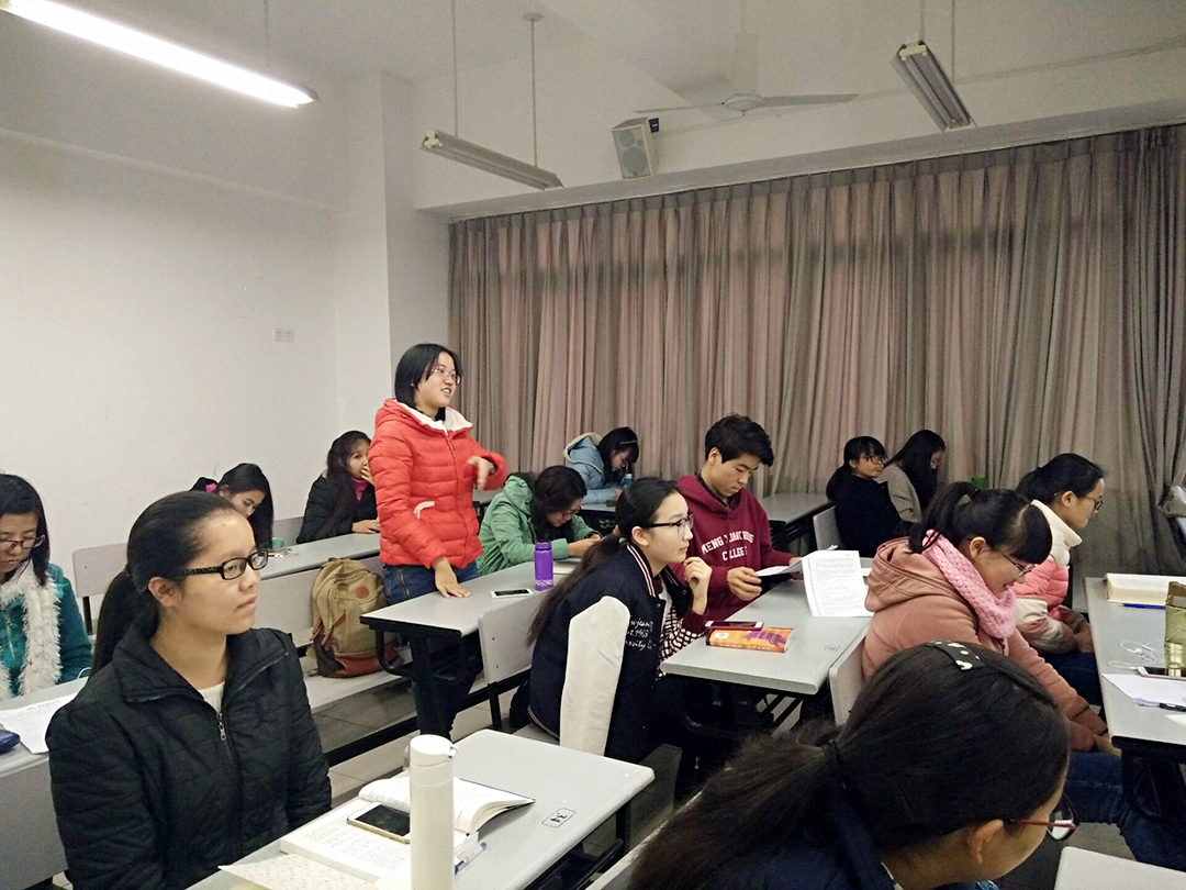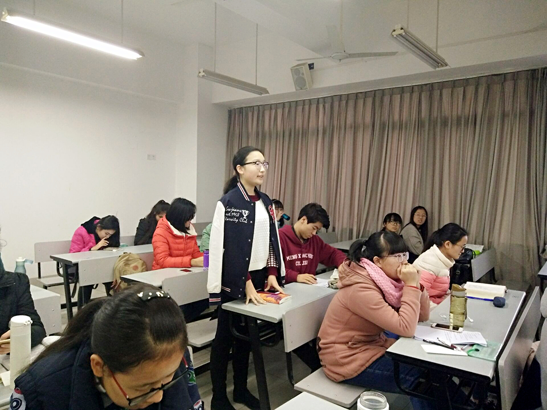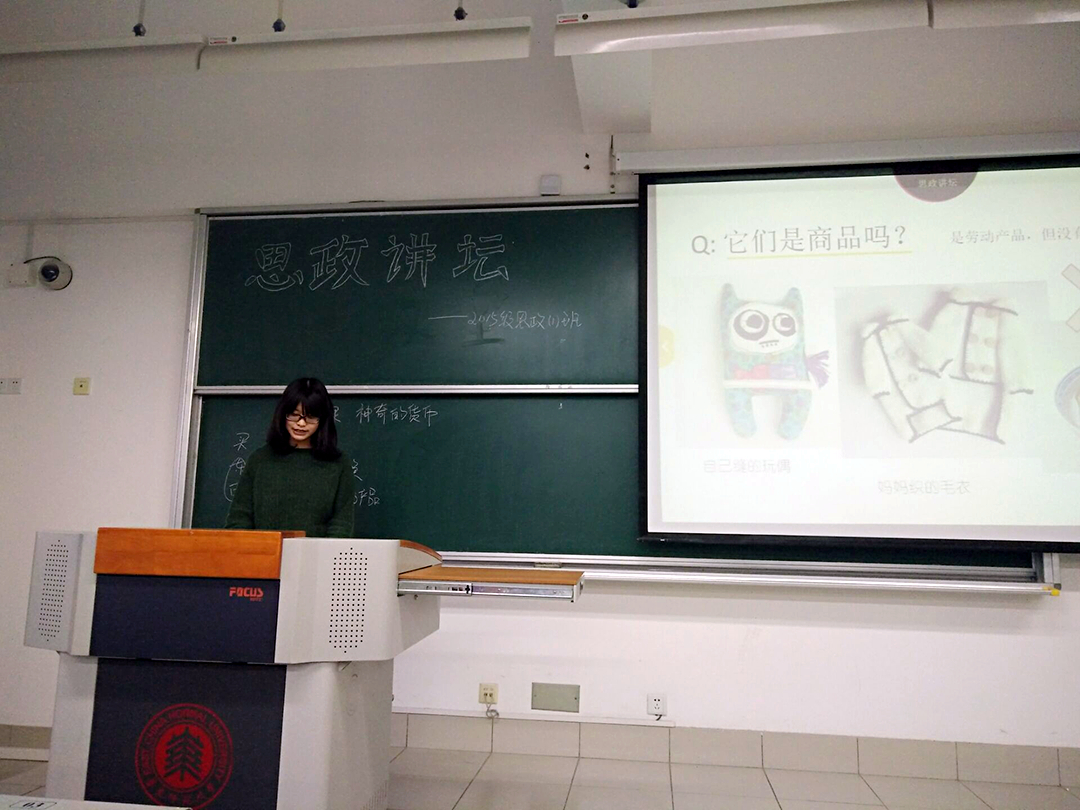然后授课的是徐阳阳同学,她首先给同学们播放了《小丸子疯狂购物》的一个片段,引出经济生活中最基本的两个概念:商品和货币。以此入手,讲授了经济生活的第一课《神奇的货币》。授课期间,不断与同学互动,由小故事引发同学们对商品交换和货币的产生缘由的思考。课后,有代表性的小练习吸引了同学踊跃回答和提问,徐同学由此总结出本节课的易错点,加深了同学们对基本定义的理解和认识,培养了同学们的质疑精神和思考能力。授课结束后,李楠同学建设性地提出应使用绿色无广告版播放器更好地进行授课的建议,冯桐华同学则对课后习题难度提出意见,王燚、曾灏冉、黄文秋等同学也对徐同学的授课形式、内容安排、教态等做了评价。