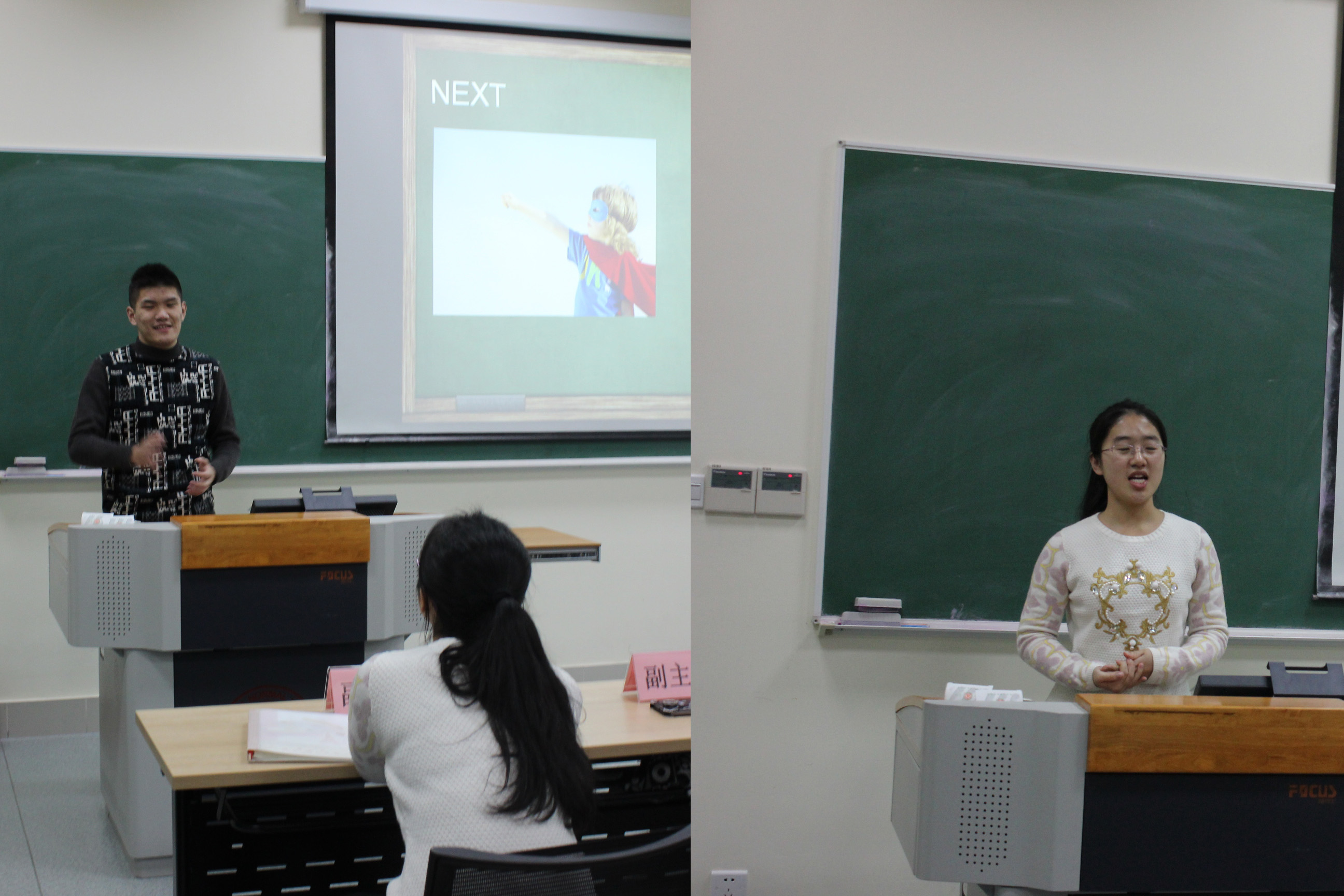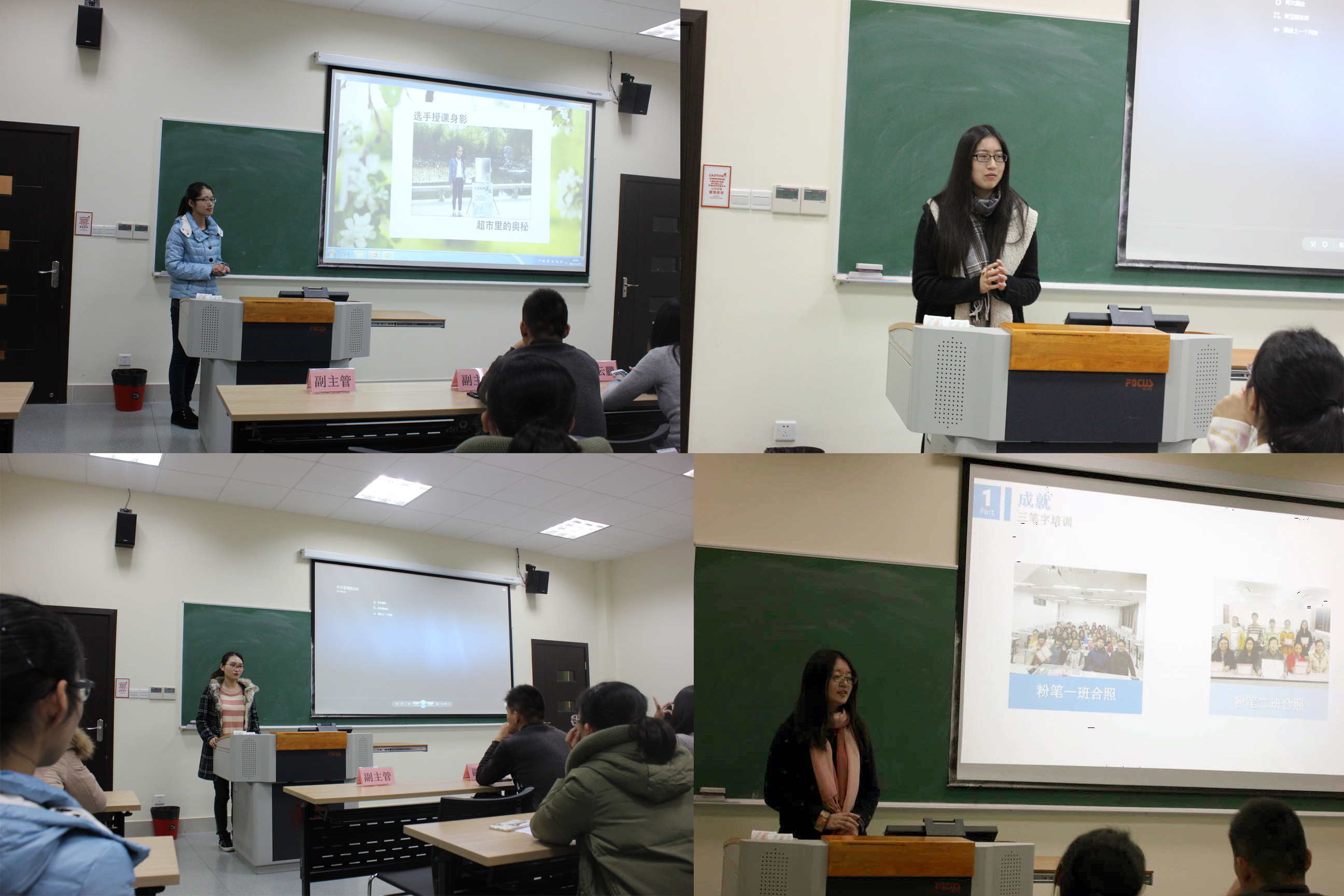 之后教师技能中心四个部门的部长分别进行发言,展示各部门在这一学期中取得的成果。实战竞技部的教师技能大赛,团结了全中心成员,增强了中心凝聚力。技能培训部展示了三笔字培训和书法大赛的成果,见证了部门每位干事的成长与成才。素质拓展部展示了 “未来教师暴走”的成果,部长柳文杰告诫大家要勇于尝试,才能收获更多。综合管理部的部长陈弘超提出,工作与学习,能力与想法,要协调工作与学习的关系,同时提高自己的能力,提出不同的想法,从中得到成长。