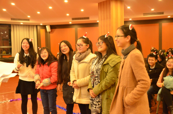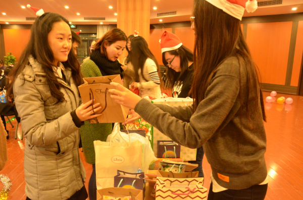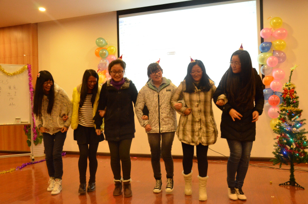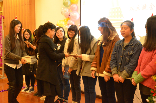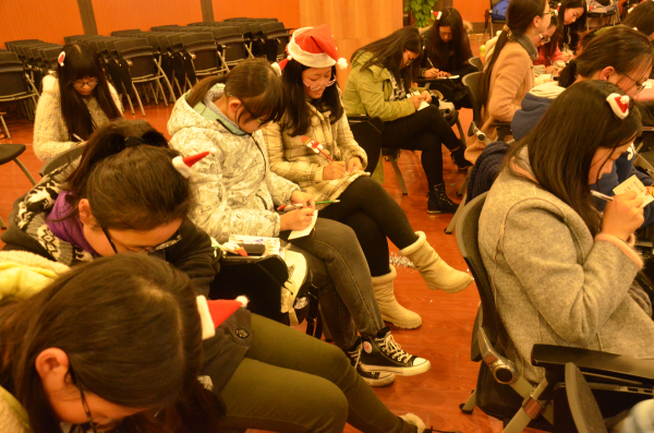 一首喜庆的春晚序曲,拉开了孟宪承书院14级英语专业“双旦”联欢的序幕。2015年12月24日晚上18点,同学们带上事先精心备好的礼物,陆续到达共享空间202。各样的精美礼物被贴上序号,将在活动的最后找到“有缘人”。同学们分成六个小组,本次分组也十分应景——童话中的铃铛、雪人、雪橇、烟囱、袜子、麋鹿。