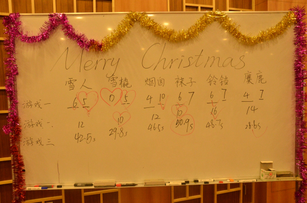 下一个游戏是正话反说,考验着小组的默契与策略。“你英语好你先上”这样的谦让,以及小组成员内的互帮互助,使得铃铛组勇摘桂冠。袜子组和雪橇组接受惩罚——歌曲合唱《童话》、《当》。熟悉的旋律响起,是否想起当年青涩的你?双旦临近,愿同学们在来年如歌词所唱“让我们红尘作伴,活得潇潇洒洒”。