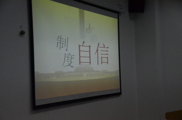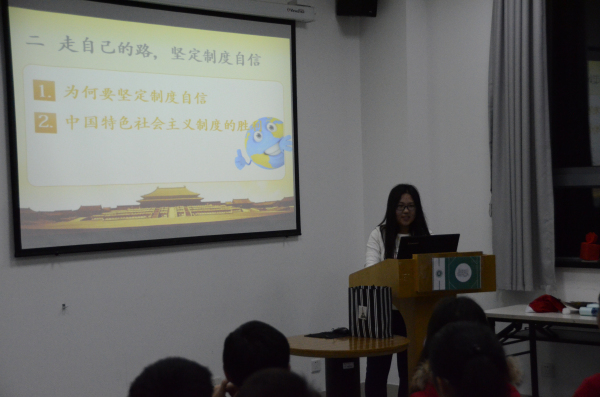 随后由班长魏慧娟同学从自己的角度为我们讲述了她心目中我们应该如何贯彻制度自信。