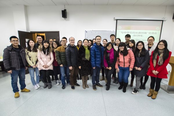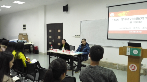 2016年1月5日18:00,承办了教务处“中学校长见面会”活动,四川专场在孟宪承书院共享空间302举行,四川师范大学附属中学副校长胡昳老师、成都市树德中学教务主任梁西民老师到场与学生们进行交流。