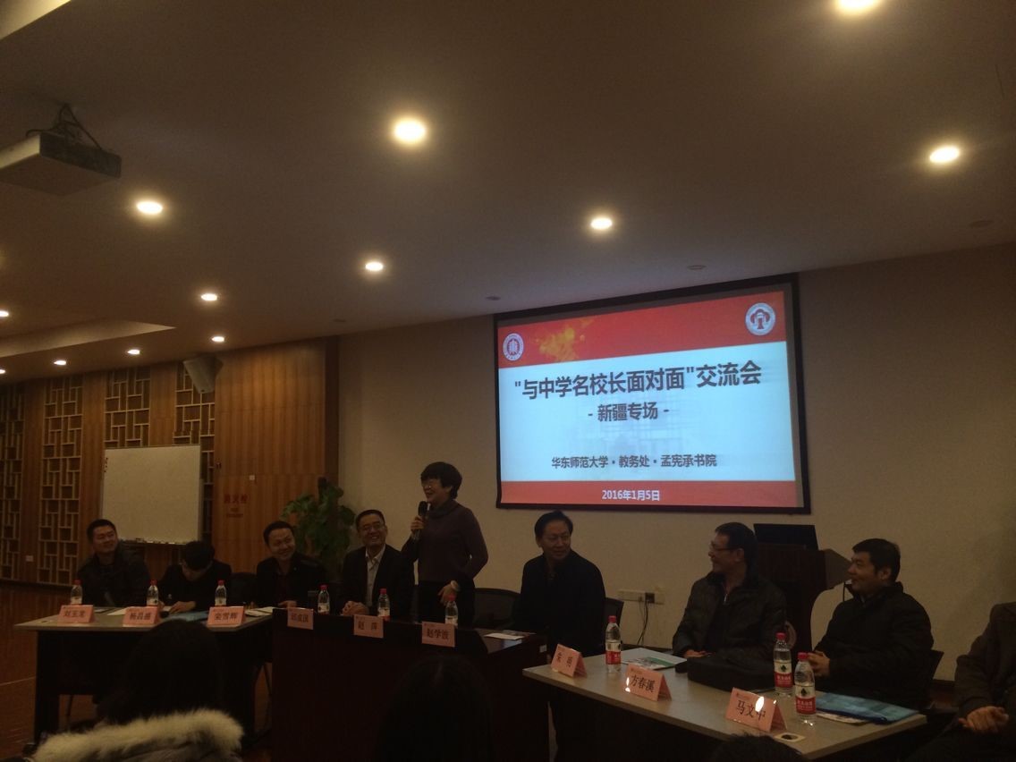 孟宪承书院承办了学校教务处“与中学名校长面对面”活动,新疆专场于2016年1月5日晚6点于共享空间202举行,到场嘉宾有新疆兵团第二师华山中学邱成国校长,栾雪辉副校长,哈密地区二中赵学波副校长,乌鲁木齐市第八中学赵萍副校长,第三十六中学朱明副校长,高级中学马文中主任,第四十一中学刘玉龙主任,第六十八中学方春溪主任,第二十三中学杨昌盛主任。