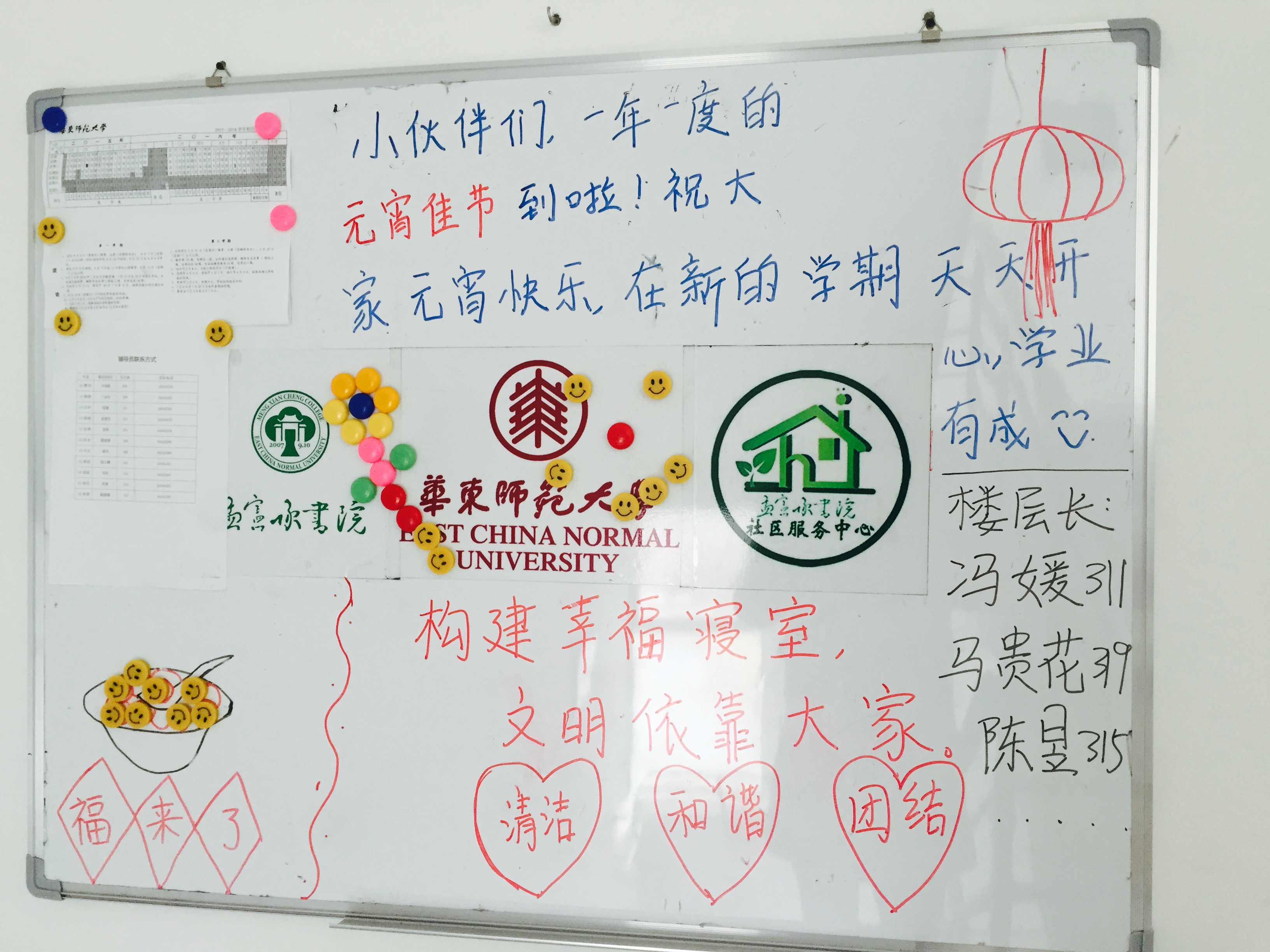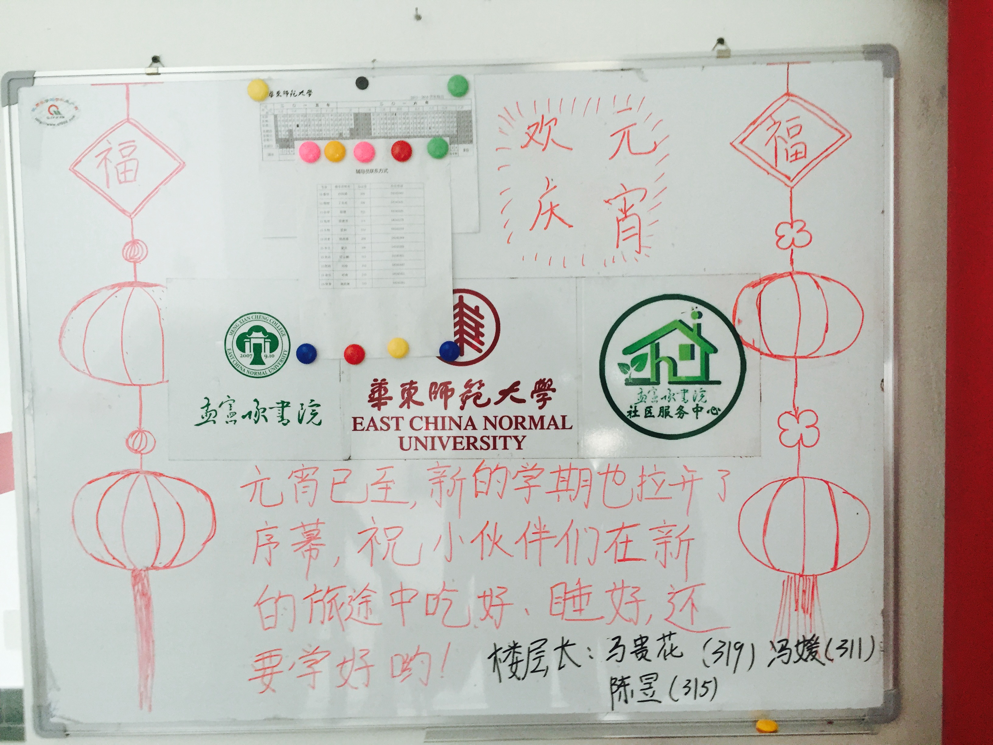 2016年2月22日,华东师大学生们开启了新学期的第一天,同时,今天也正逢农历正月十五,是中国传统的元宵佳节。按中国民间传统,在这天,人们喜猜灯谜、共吃元宵、合家团聚、其乐融融。为了引导学生热爱传统文化,继承和发扬优良传统,社区服务中心的楼层长们在学生生活园区营造了浓浓的节日喜乐气氛。