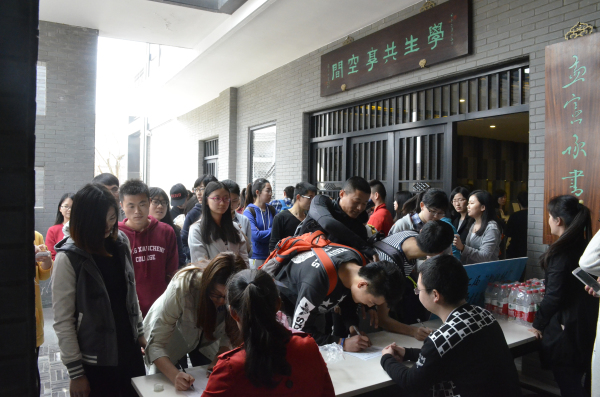 活动地点设置在孟宪承书院共享空间门口,三点刚过,这里便人群熙攘,接踵摩肩,前来签到的同学络绎不绝,站满了共享空间门口的空地,场面可谓热闹且壮观。