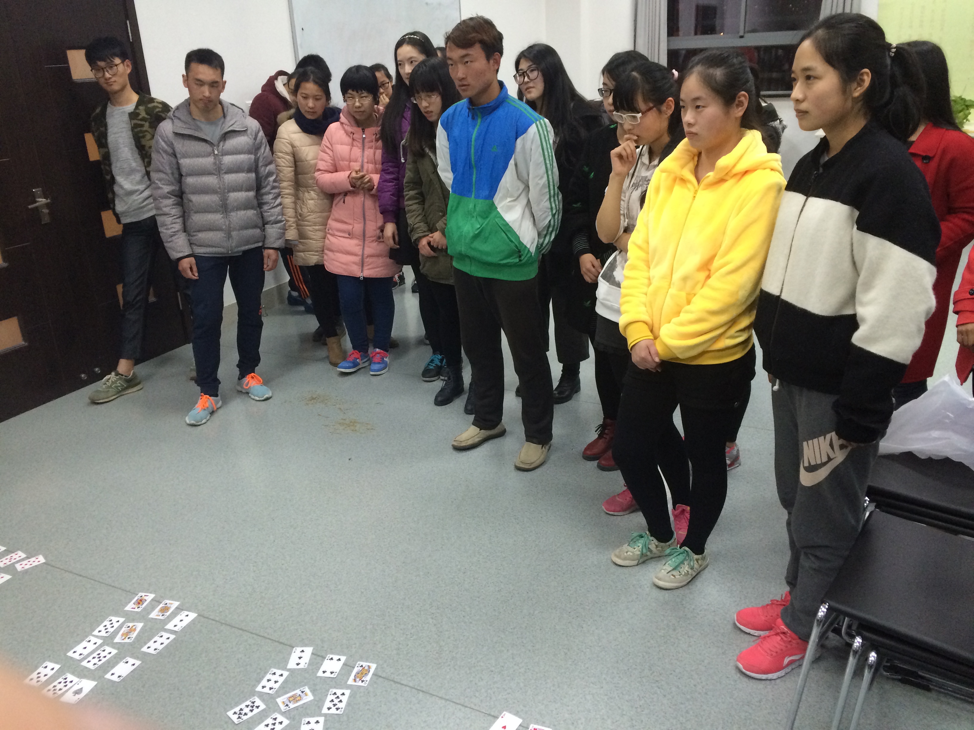 在主管张泽远的主持下,大家围成圈,交流寒假的心得,分享假期中难忘的时光;接下来以六人为一组,展开了别具特色的翻牌记牌比赛,教会成员们互相信任和随机应变的能力;最后,大家随机站队,在无沟通的前提下完成规定时间内闭眼无声地按年龄排序的任务,使成员们明白了如何在有限的条件下找到最有效的沟通方式。