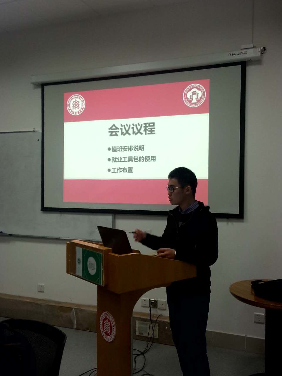 关于值班安排说明,肖宇组长强调了每天必须有一个同学在值班的岗位上,认真负责完成工作任务。此外肖宇组长还向大家说明了就业工具包的使用,这将会在我们今后的接待工作中起到重要作用。